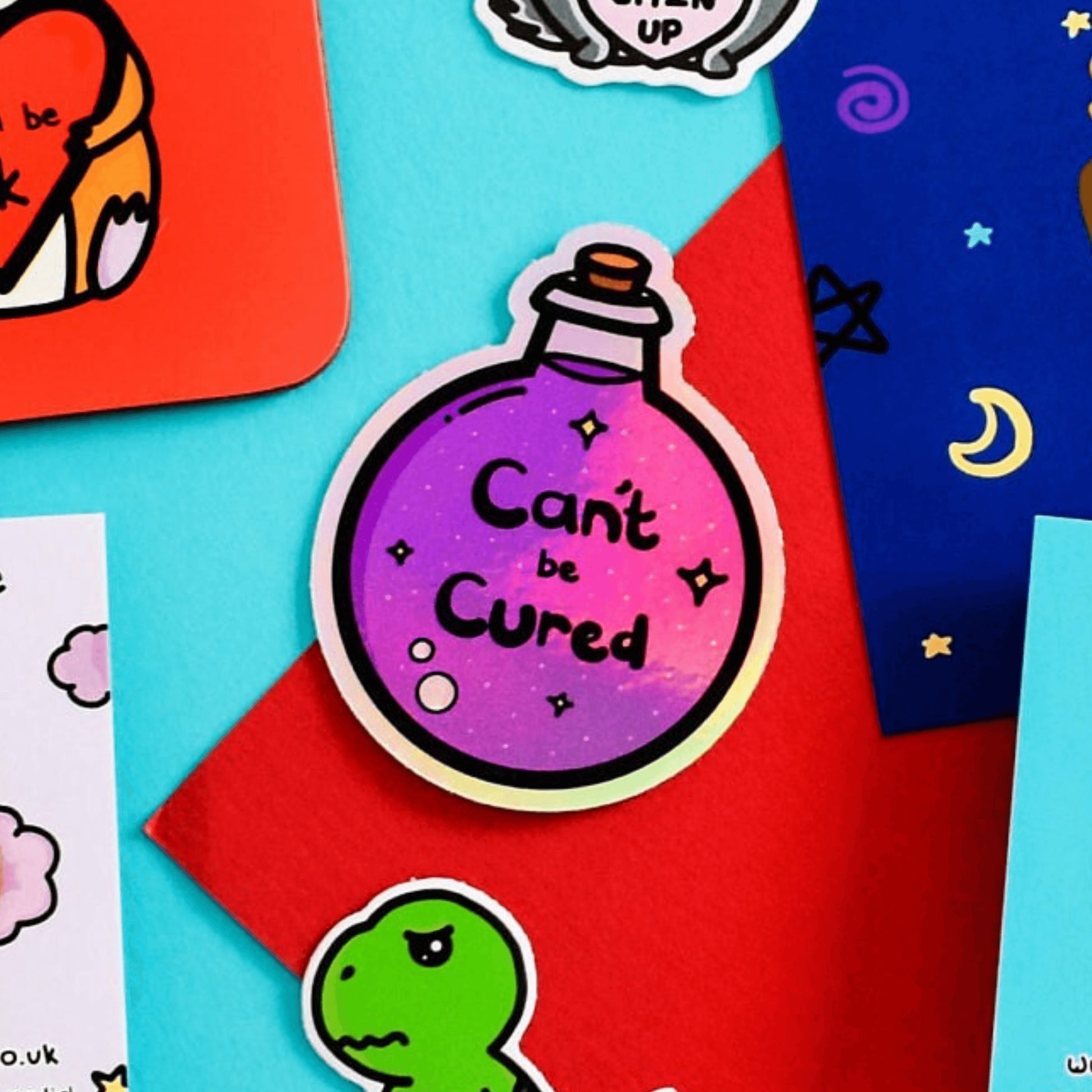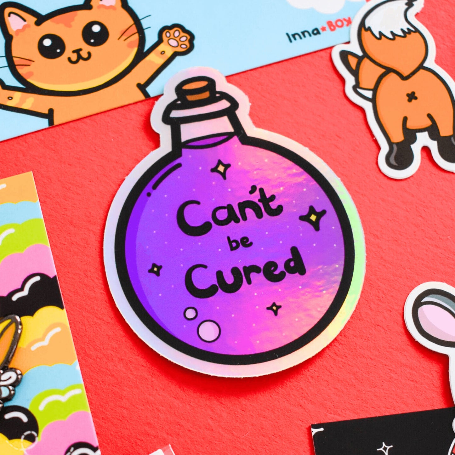 Add a touch of whimsy to any surface with our Can't Be Cured Holographic Sticker! This quirky sticker features a fun holographic design that's sure to catch anyone's attention.