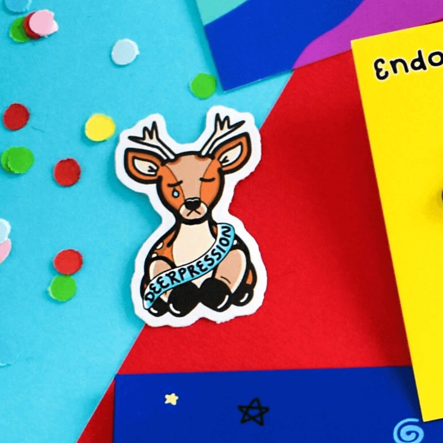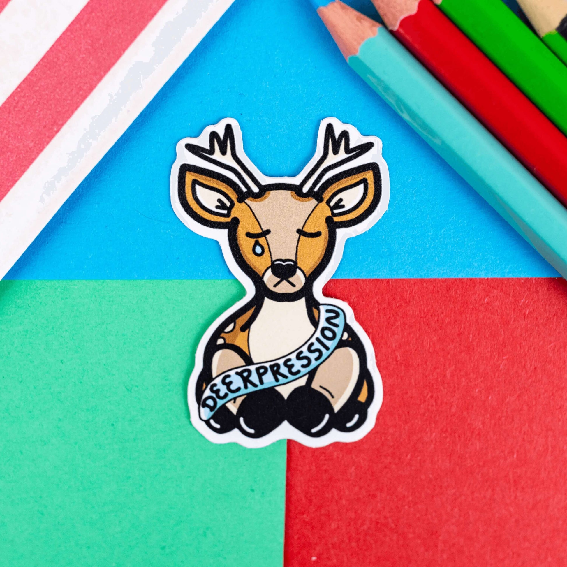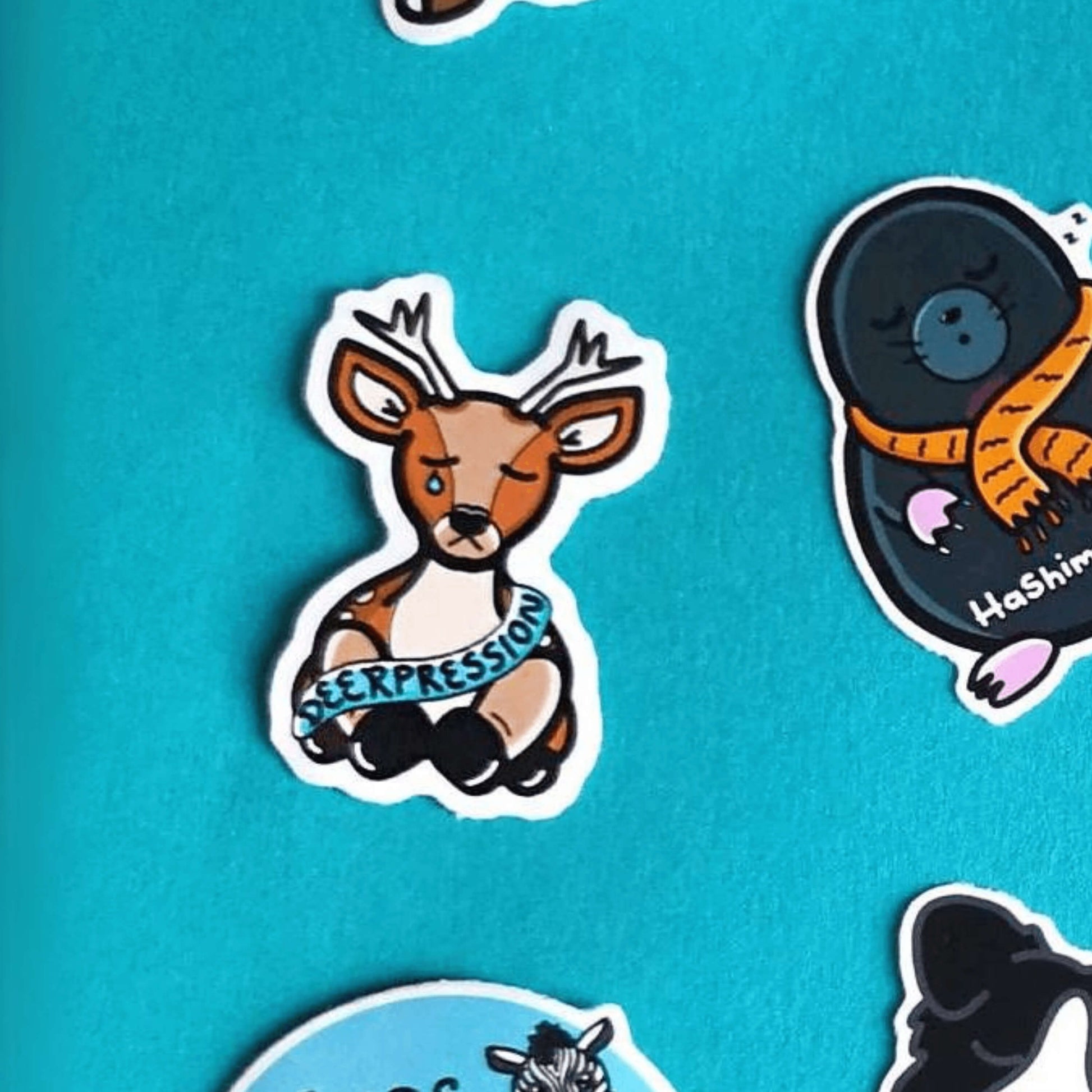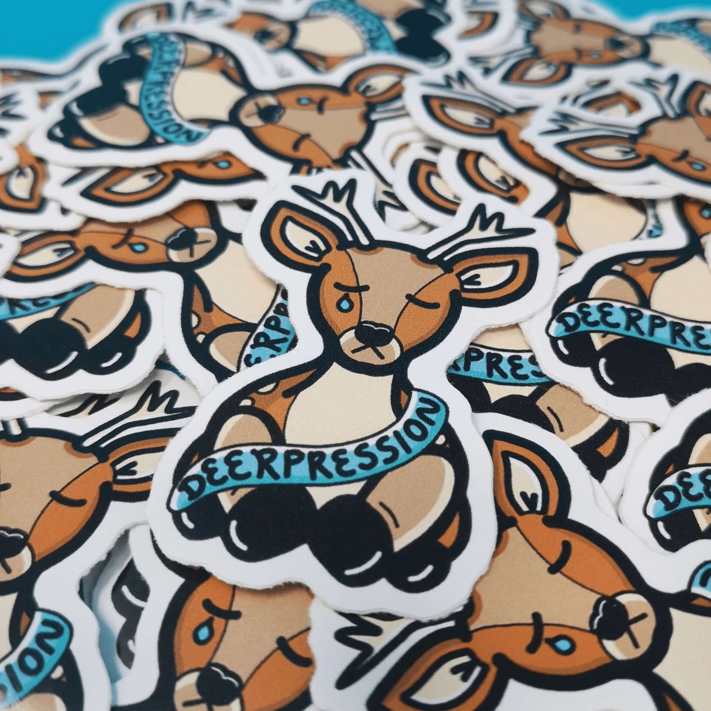 Cheer yourself up with this Deerpression sticker! It's a great reminder to stay strong and to never give up on yourself. Show your commitment to mental health with this cute deer sticker.