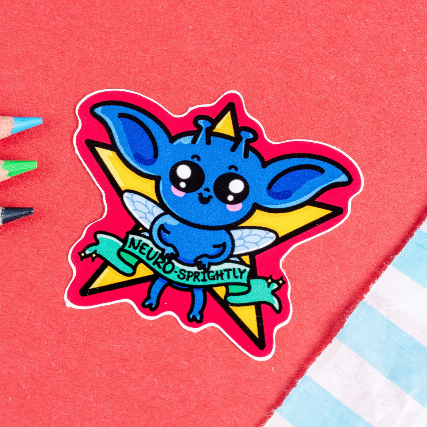 Celebrate your unique sparkle with the Neuro-Sprightly Sprite Sticker! This vibrant little sprite, with its big ears, fairy wings, and joyful expression, is here to remind you that being neurodivergent is something to embrace. Stick it somewhere special and let your sprightly spirit shine! 💙✨