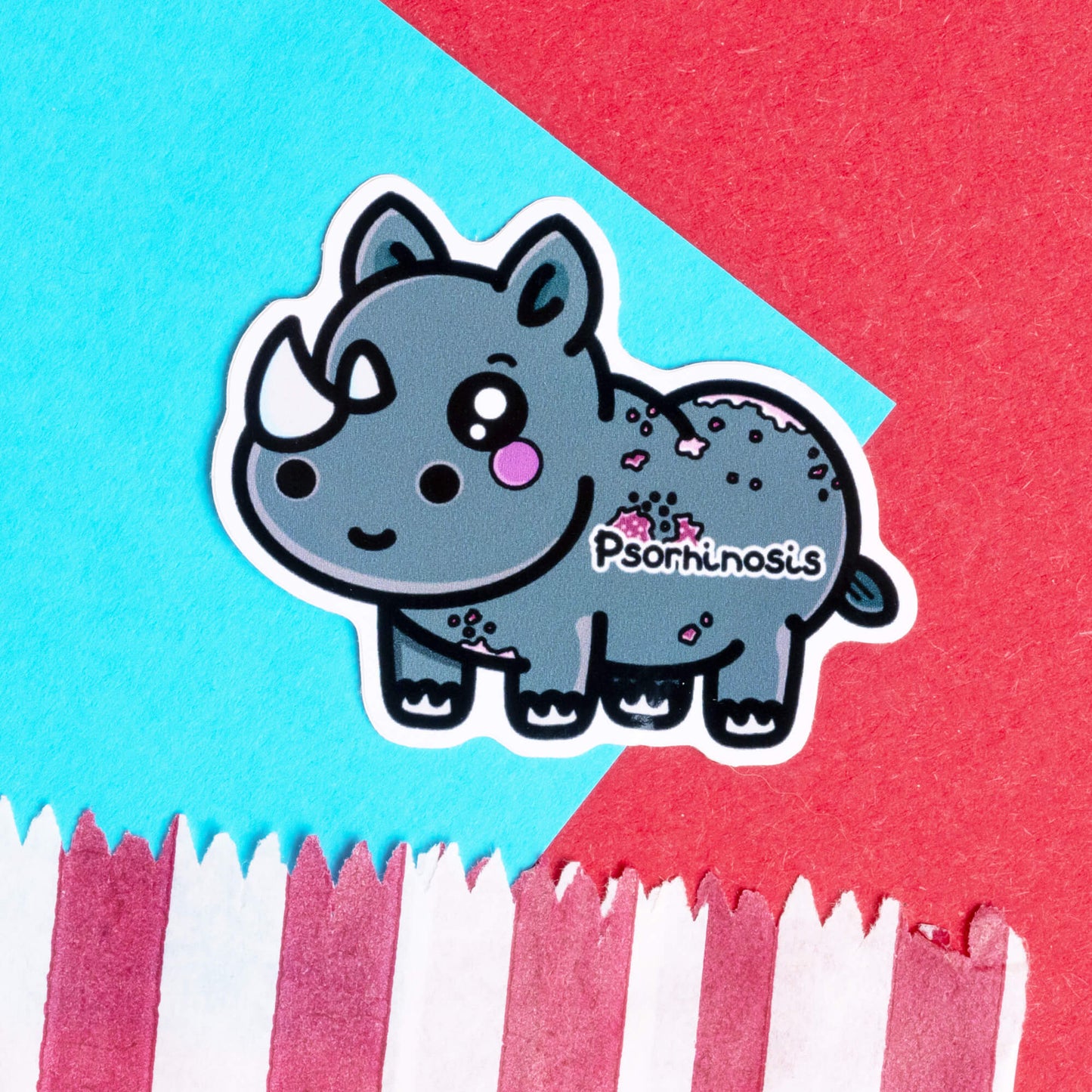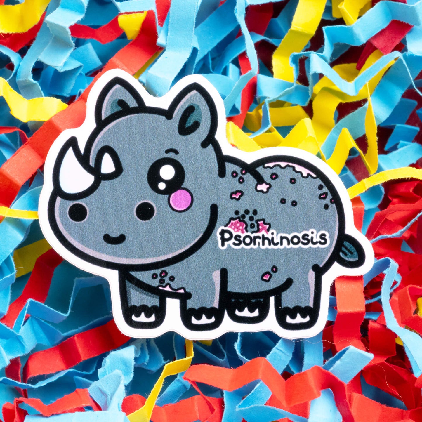 Introducing our Psorhinosis Rhino Sticker - Psoriasis! This quirky and fun sticker is perfect for those living with psoriasis or those who want to show support. Show your unique sense of humour and raise awareness with this playful design. Stick it on your laptop, water bottle, or anywhere you want to make a statement!