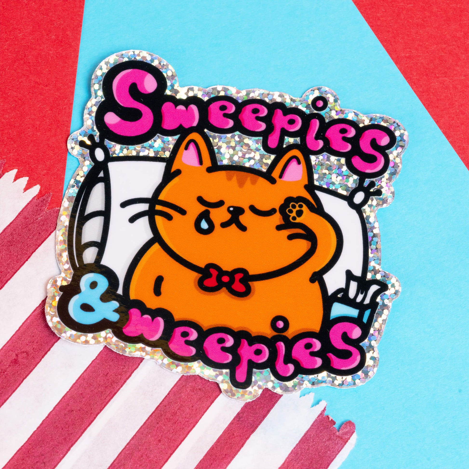 Get your paws on this purr-fect Sweepies and Weepies cat sticker! This holographic glitter cat sticker will add a touch of feline fun to any surface. Perfect for cat lovers and anyone looking to add some sparkle to their life. (Meow-some addition to your sticker collection!)